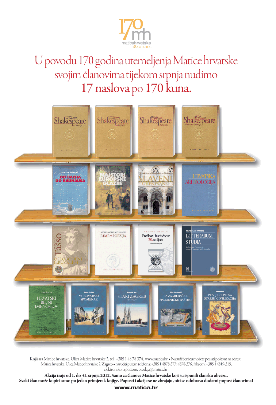 Pozivamo Vas da u akciji Matice hrvatske 17 naslova po 170 kuna kupite izabrane knjige. Ovoga ljeta, o 170. obljetnici, nudimo Vam birane naslove iz hrvatske i svjetske književnosti, umjetnosti i znanosti.