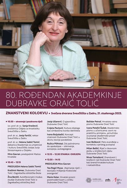 Odjel za kroatistiku Sveučilišta u Zadru u suradnji s Akademijom za umjetnost i kulturu u Osijeku i Maticom hrvatskom organizira znanstveni kolokvij “80. rođendan akademkinje Dubravke Oraić Tolić”. Kolokvij će biti održan 21. studenoga u Svečanoj dvorani Sveučilišta u Zadru u 10:30 sati.