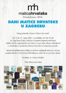 Dragi prijatelji i članovi Matice hrvatske!Od 9. do 13. rujna 2019. u razdoblju od 9 do 19 sati na Trgu...