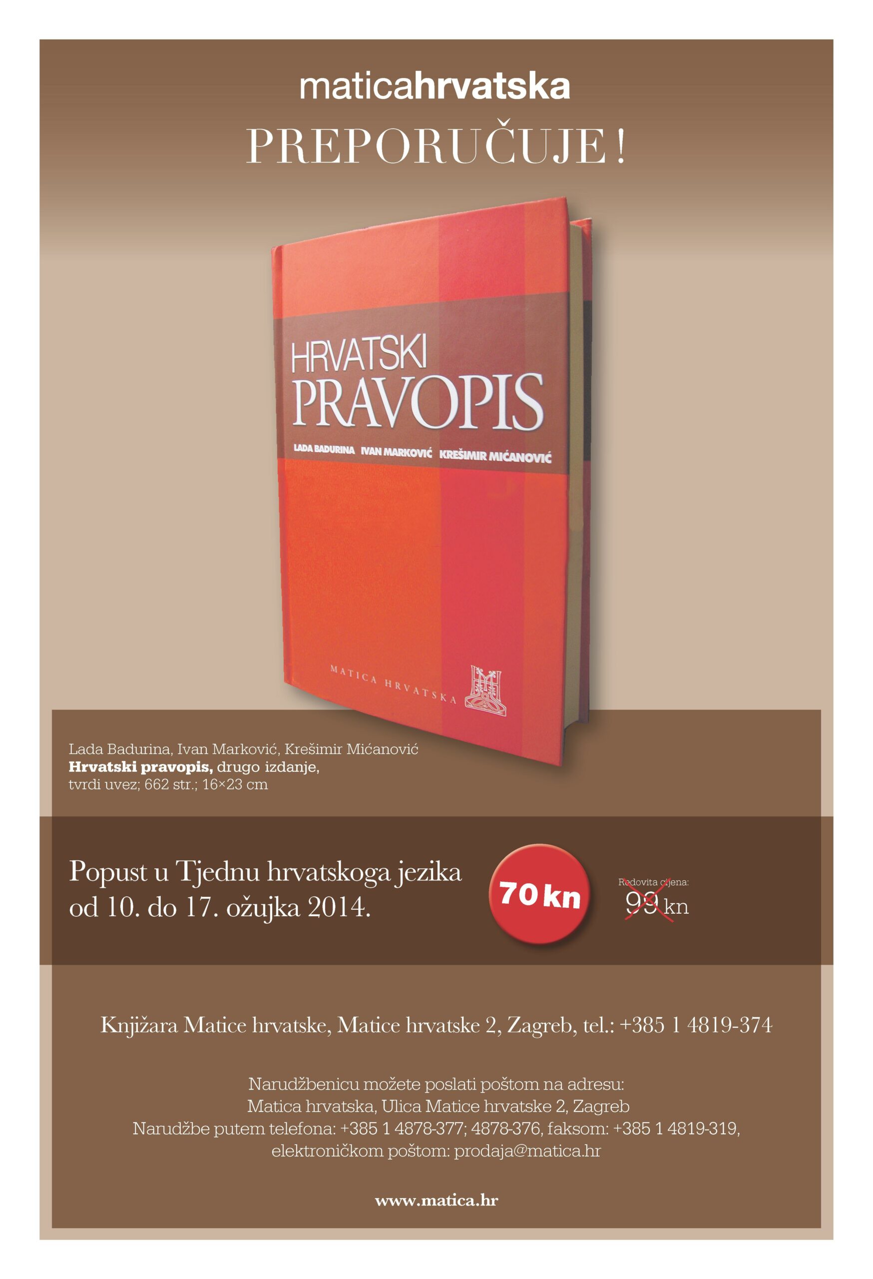 Matica hrvatska u Tjednu hrvatskoga jezika, od 10. do 17. ožujka 2014. godine, preporučuje Hrvatski pravopis po prigodnoj cijeni od 70 kn (redovna je cijena 99kn).