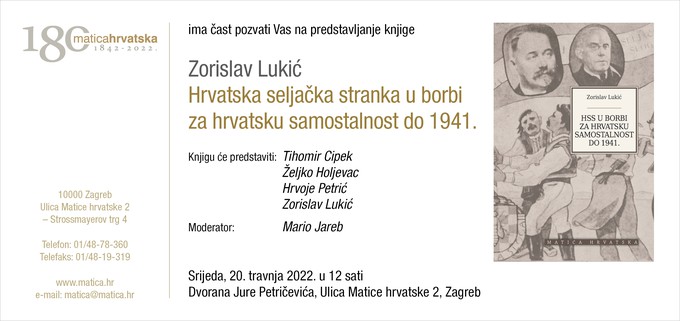 Matica hrvatska poziva vas na predstavljanje knjige Zorislava Lukića Hrvatska seljačka stranka u borbi za hrvatsku samostalnost do 1941. u izdanju Matice hrvatske. Predstavljanje će biti održano u srijedu, 20. travnja 2022. u 12 sati u Dvorani Jure Petričevića.